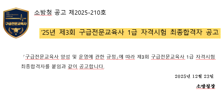 소방청이 창작한 '2025년 제3회 구급전문교육사 1급 자격시험 최종합격자 공고' 저작물은 공공누리 "제 1유형" 조건에 따라 이용할 수 있습니다.